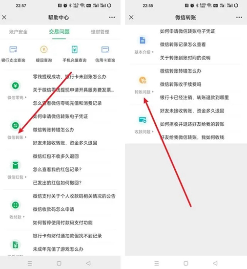 3、然后在【交易问题】中找到并点击【微信转账】,接着点击【转账问题】;